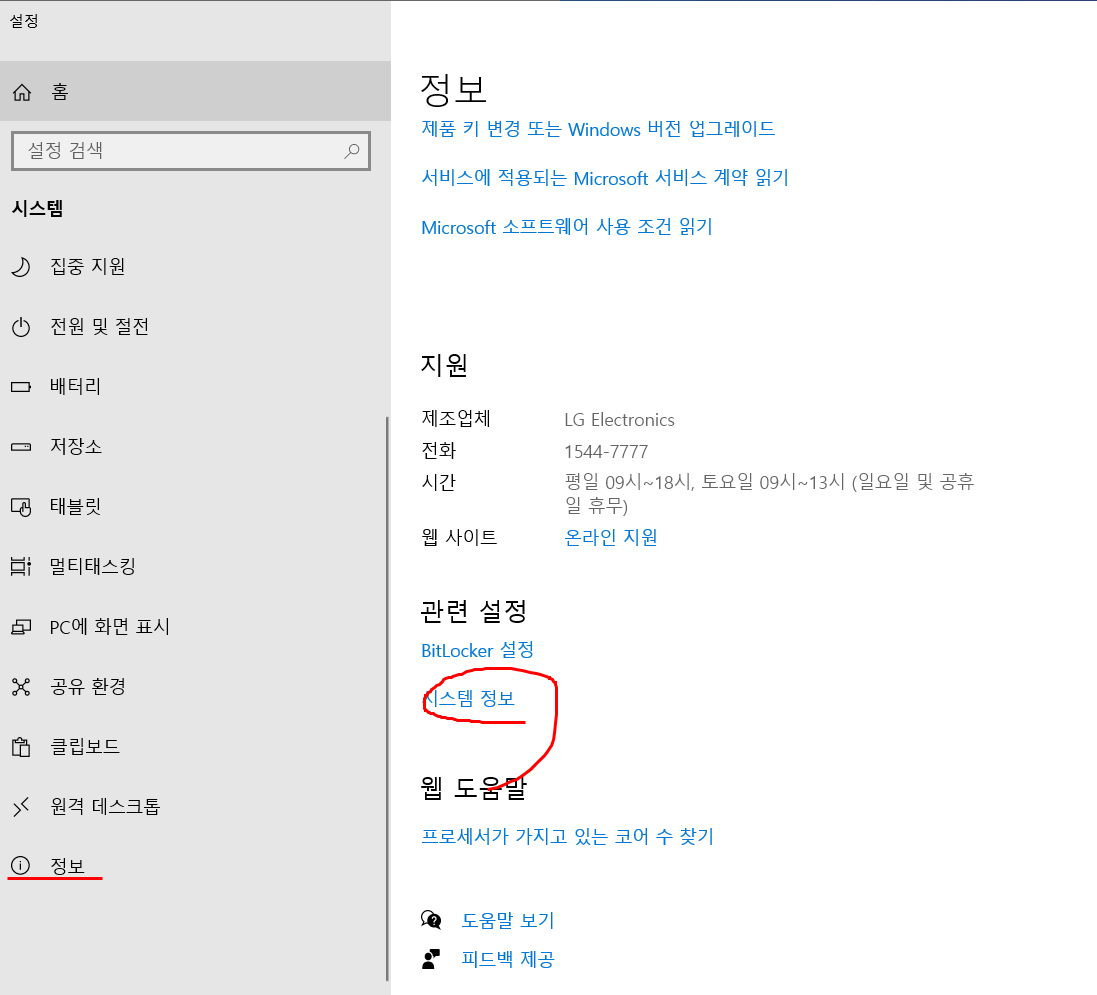 왼쪽 메뉴에 정보 클릭 후 빨간색 원으로 표시되어 있는 시스템 정보를 클릭해줍니다.