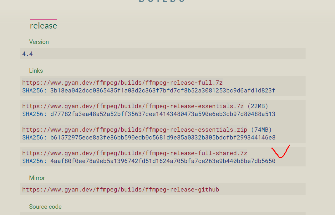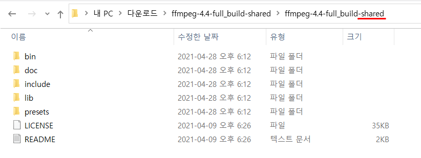 ffmpeg-release-full-shared 는 개발용으로 사용하는 버전입니다.(크기는 127MB, 4.4 버전 기준)