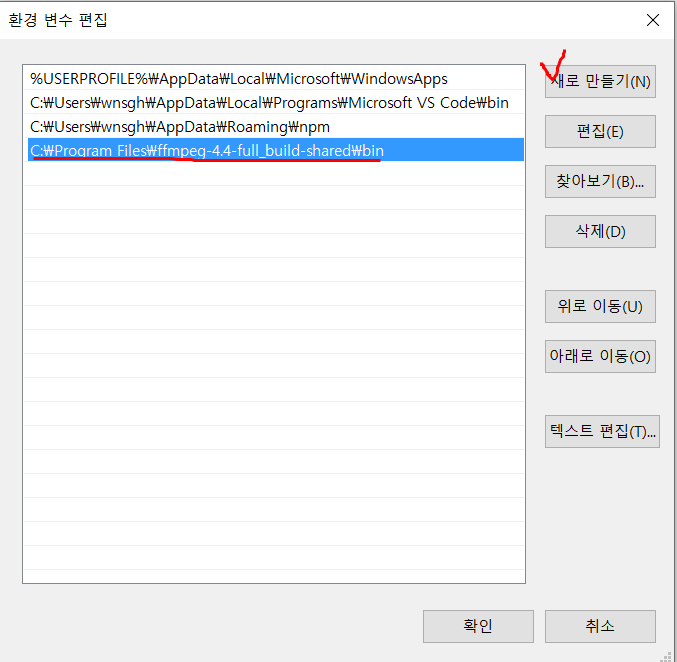 새로 만들기를 클릭하여 ffmpeg-4.4-full_build-share/bin 폴더가 있는 경로를 추가한 뒤 하단의 확인을 클릭합니다.